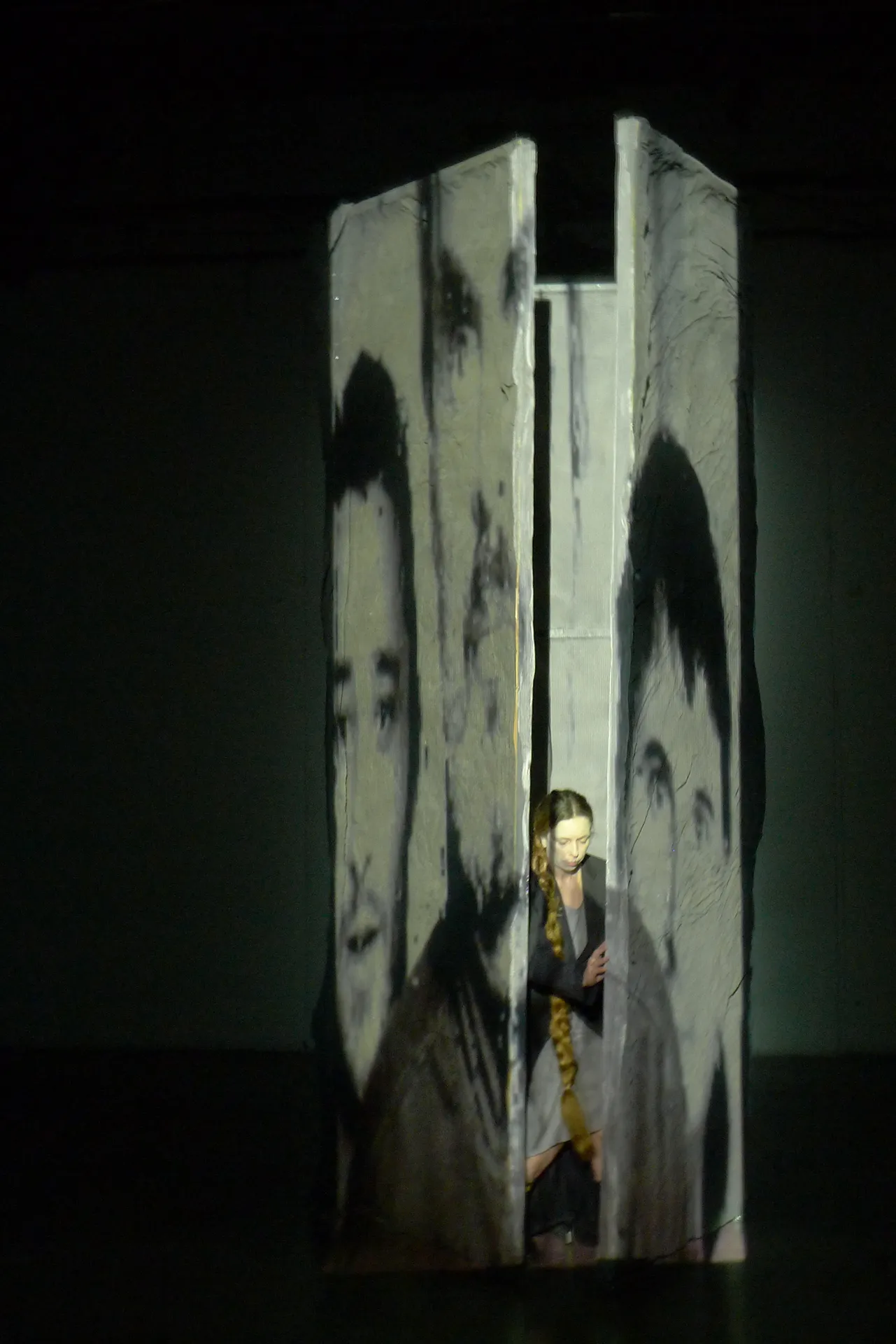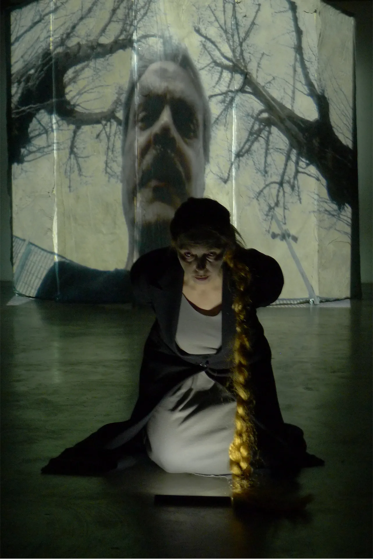 Having placed Shakespeare's Macbeth as an investigative text then brings the questions directly to the centre, to the completion of a decisive action, of a decisive fact for the biography of the actor and the protagonists of the drama: “I did it, the fact. I heard the owl screaming and the crickets watering. I think I heard: Sleep no more! Macbeth killed Sleep, innocent Sleep.” Delirium, guilt, visions, and death are paragraphs of a lived, textual life that overlap within a crystal ball where destinies, witches, and blood rain down from above like snow, after turning the ball upside down and restoring its shape. The actor then truly becomes the crystal image of his past and present, the verses of Macbeth and the Lady, as well as those of the witches seem to emerge, with unknown and only minimally correct technique, like knife blades circling real and not fragments of a delirious dream. The real and virtual long-distance dialogue between the actor detained in his place/castle and the actress performing on his stage becomes an exchange of voices and whispers between two contemporary Pyramus and Thisbe; the two lovers and accomplices are distant, and in between lies the wall of civilized life and real society.