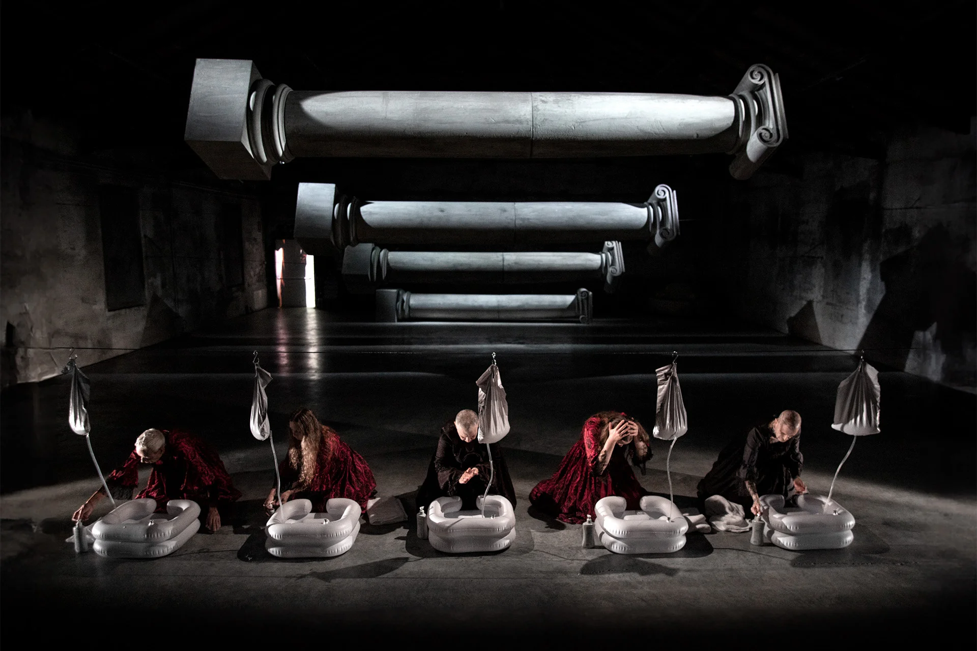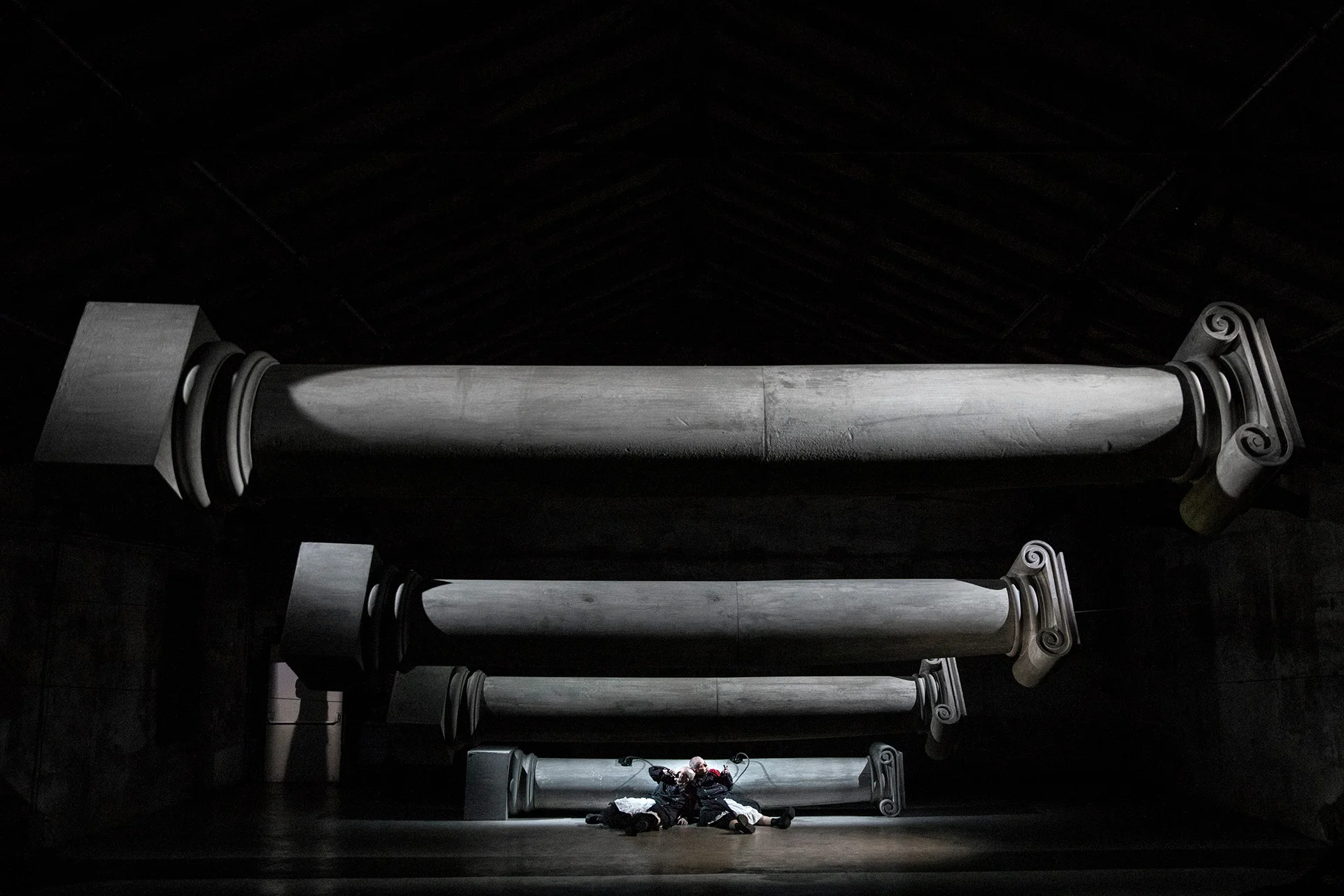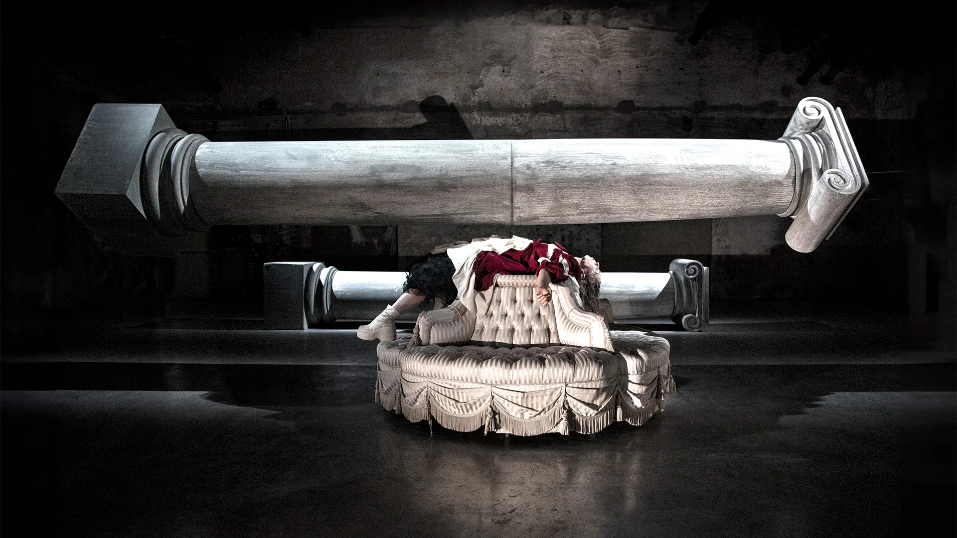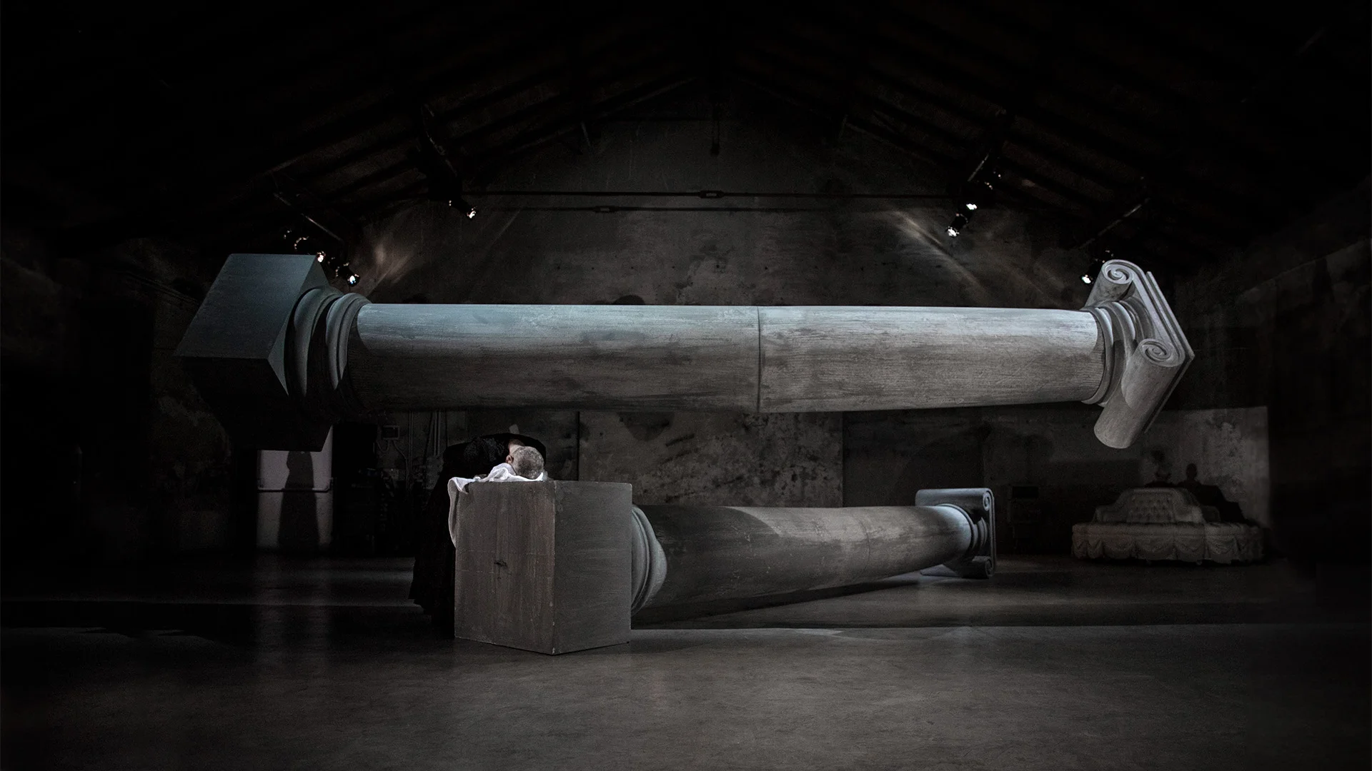 Sospese orizzontalmente in un interno segnato dal lavoro operaio al tempo del primo macchinismo industriale, le colonne esfiltrate dalla facciata della Chiesa veneziana della Maddalena, la discepola sapiente prediletta da Gesù, istituiscono uno spazio esorbitante, eccedente, deviante dalla regola della verticale utile ai fedeli obbedienti, inginocchiati e senza sogni.