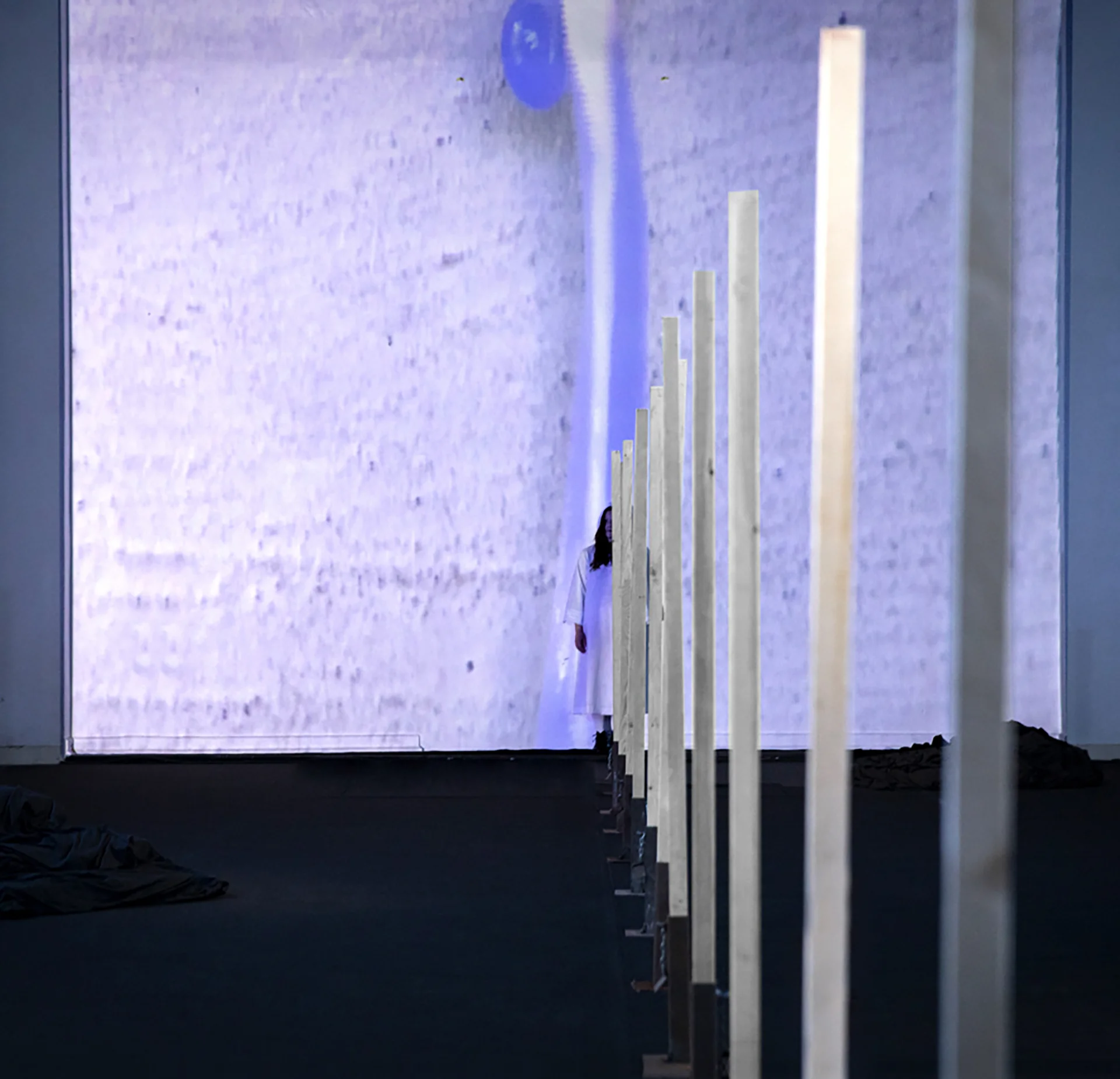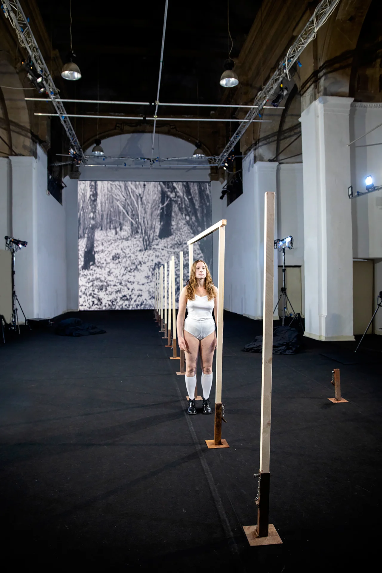 Lo spazio è attraversato da quattordici aste lignee in misura e forma simili alle lance medievali per la caccia al cinghiale.