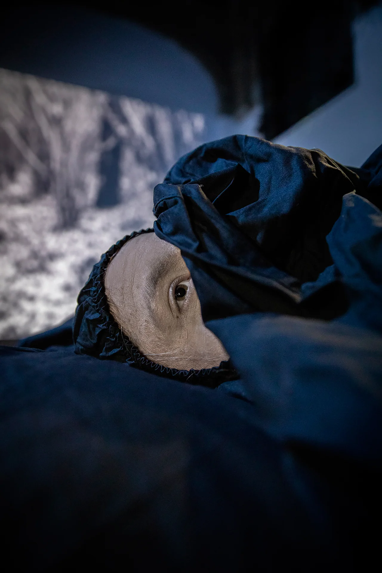 Una cinghialessa avanza nel bosco, uno scoiattolo tra i rami, due lumache in corteggiamento, un corpo d’uomo vecchio e nudo. Un volto di donna in primissimo piano, la bocca e i denti e gli occhi e il parlare muto all’altra sé nello spazio reale, e anche a te spettatore che le osservi entrambe.