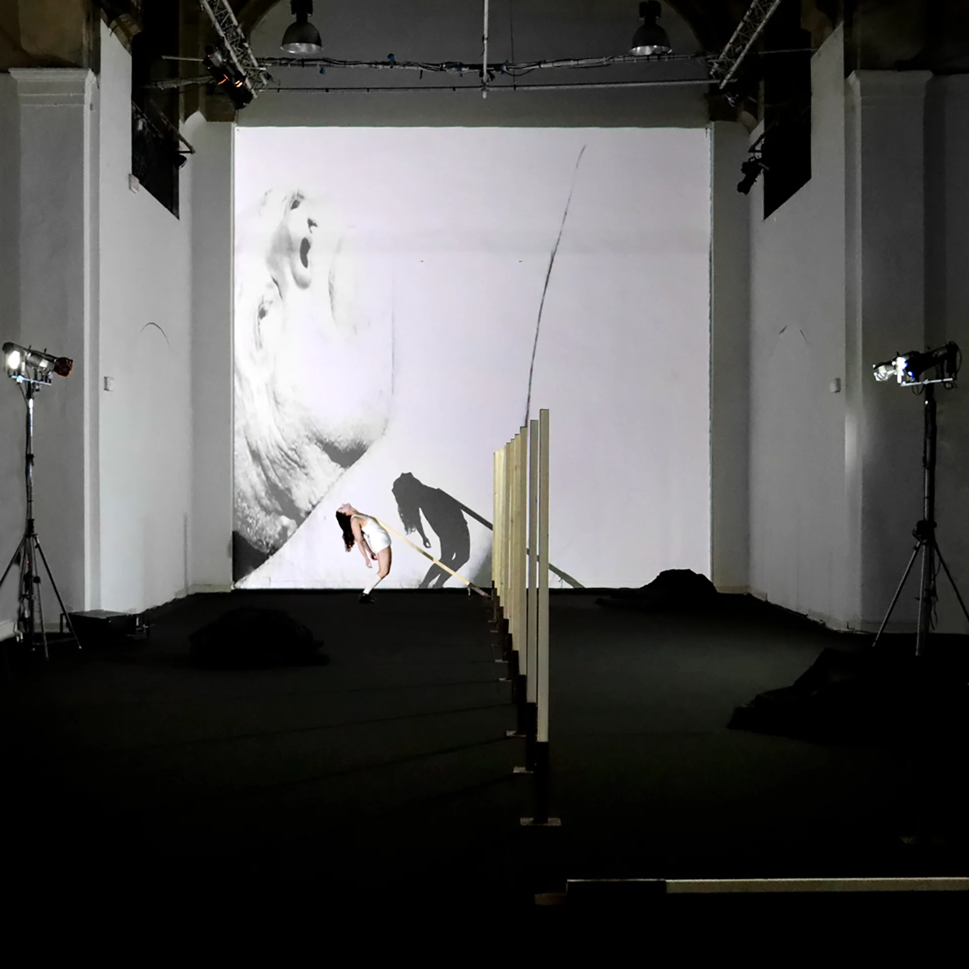 È il volto dell’attrice in immagine dialogante con il suo doppio corporeo, amazzone a due teste, libera di morire dentro e fuori la battaglia.
