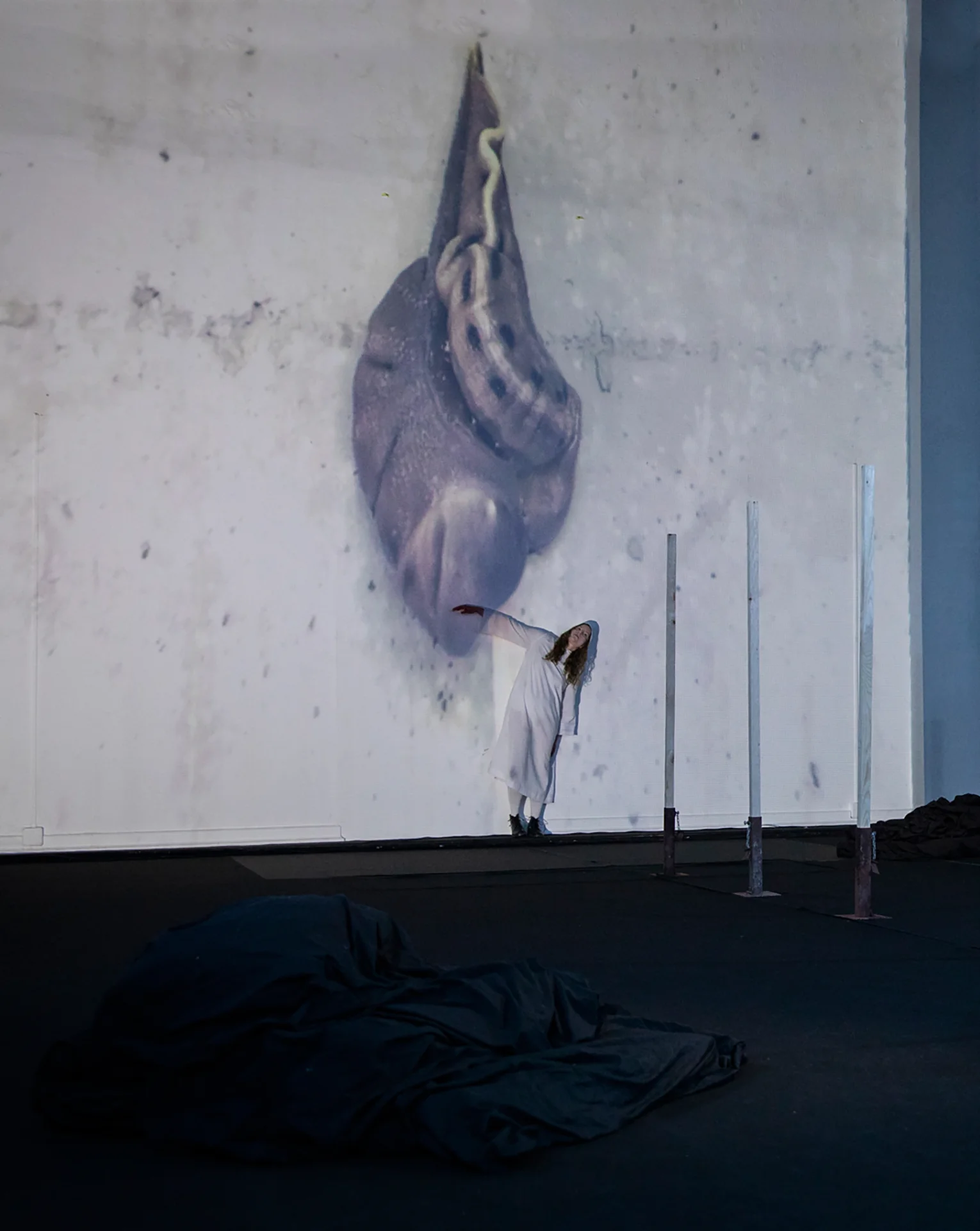 Ogni quadro video è in bianco e in nero, tranne l’amplesso tra le due Arionidi, molluschi gasteropodi senza conchiglia, senza casa, senza scudo a difendere il corpo esposto. Il colore appare solo per i due molluschi, cromatismi cangianti nel movimento rotatorio dall’alto verso il basso.