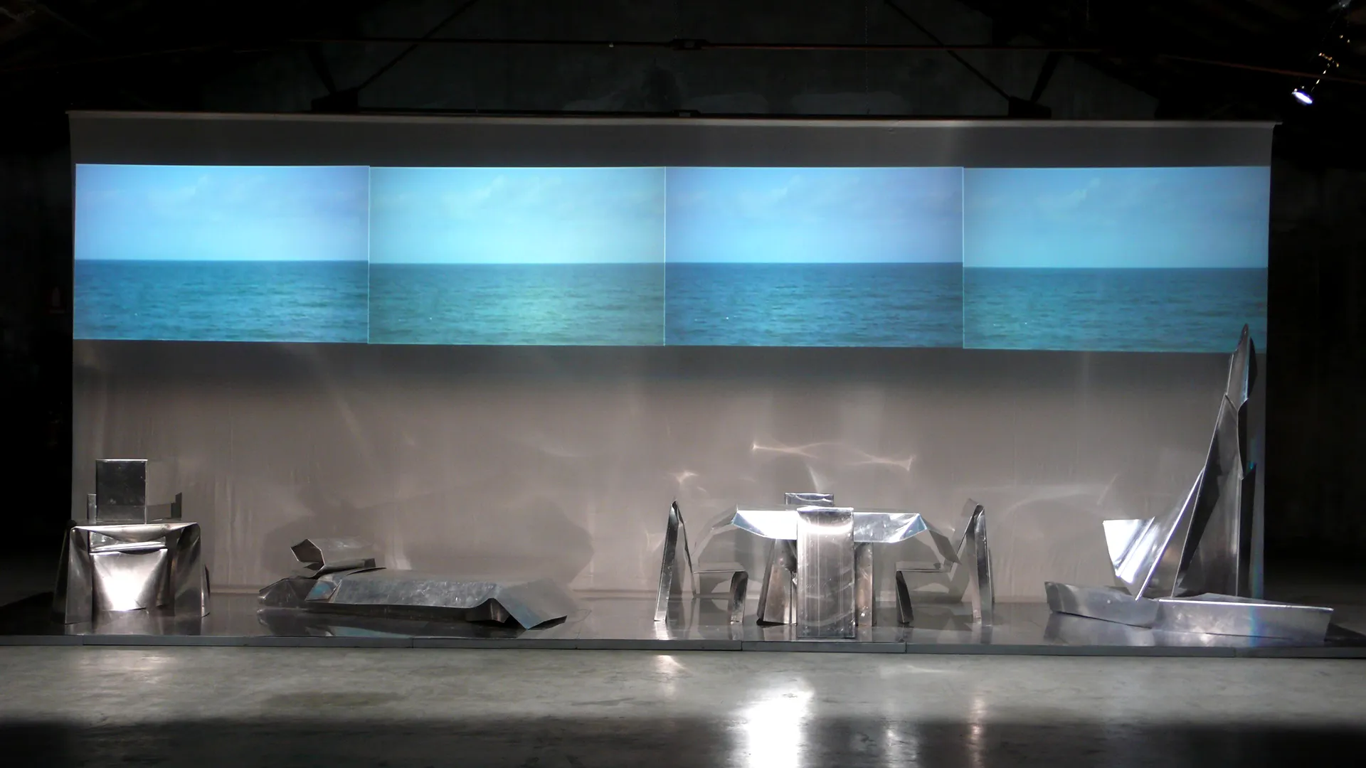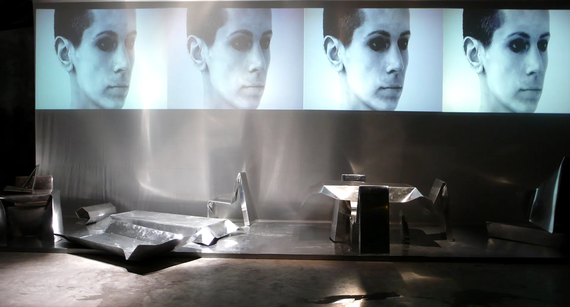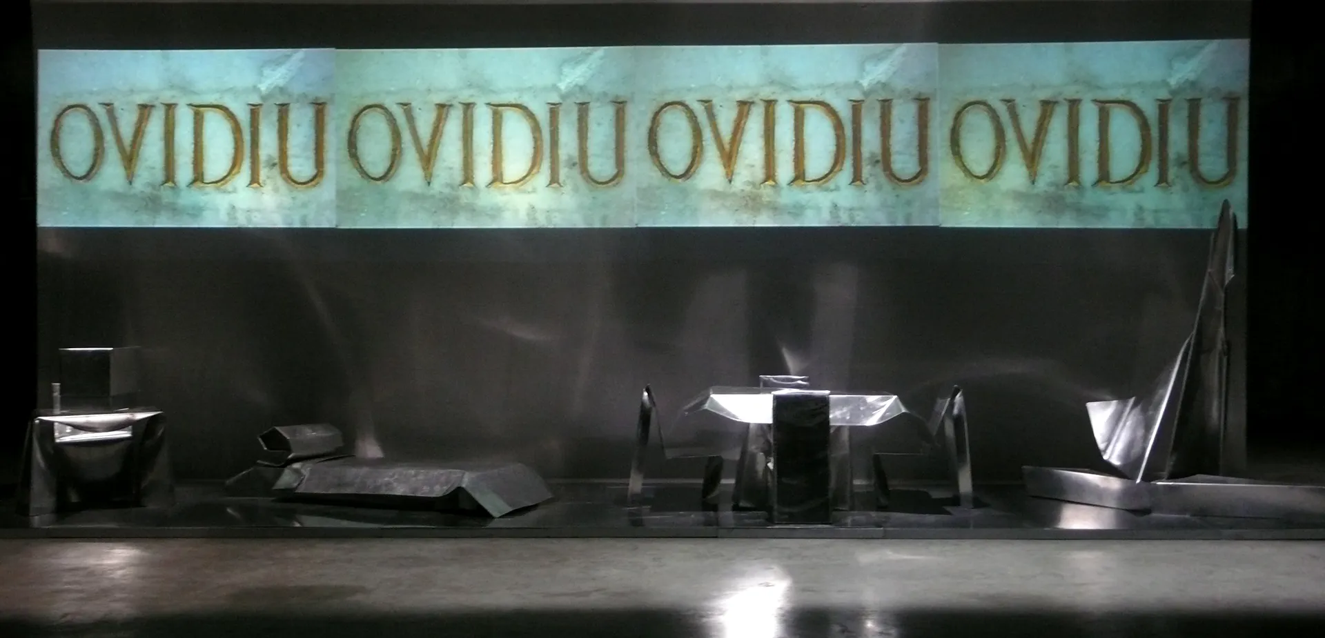 La materia contorta e piegata, il design del pensiero si dispone in uno spaccato, come un rilievo, cinemascope del presente esiliato. Gli oggetti, freddi e lucenti, arredano il pavimento base d’acciaio, dentro i confini del Paese di Exilium. Appena fuori, in terra già straniera, agiscono i corpi che, esponendosi nella più intima occupazione, ri-formano epifanie e parentesi di memoria vitale, umana, sociale. Ma è finzione, reale è solo l’abitare – room dello show – del ricordo, del rimando, del gesto d’addio, e poi del ritorno.