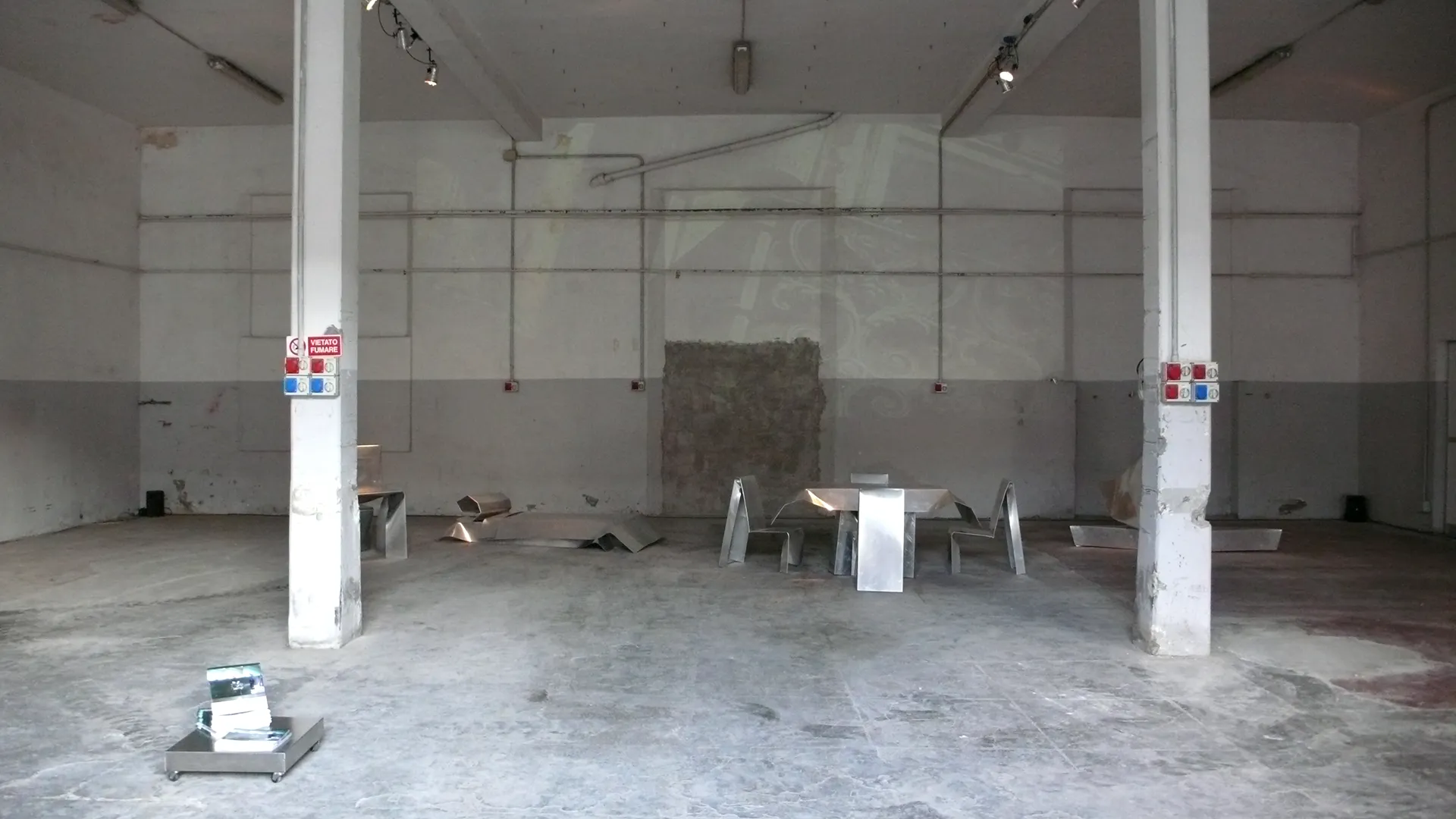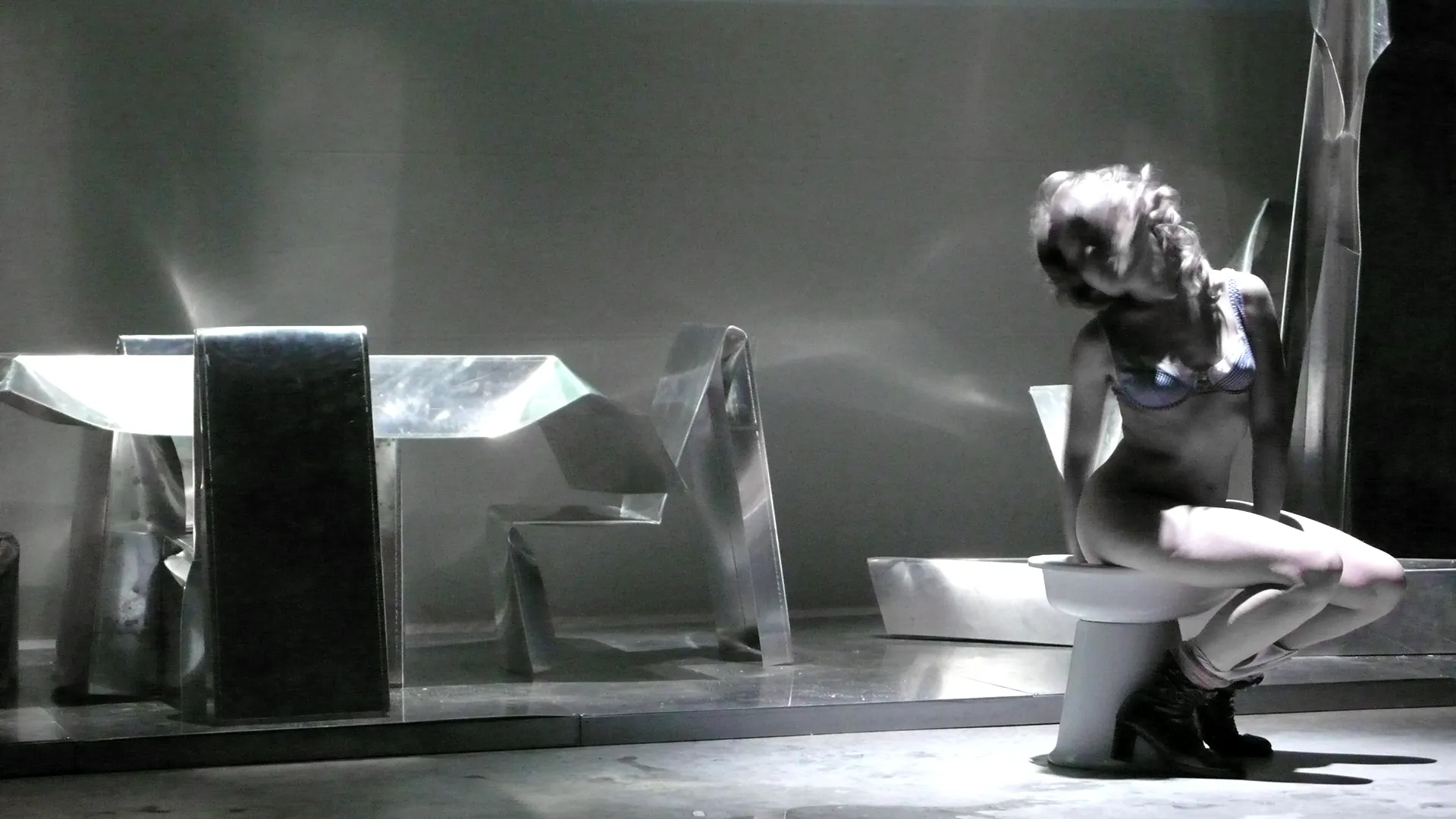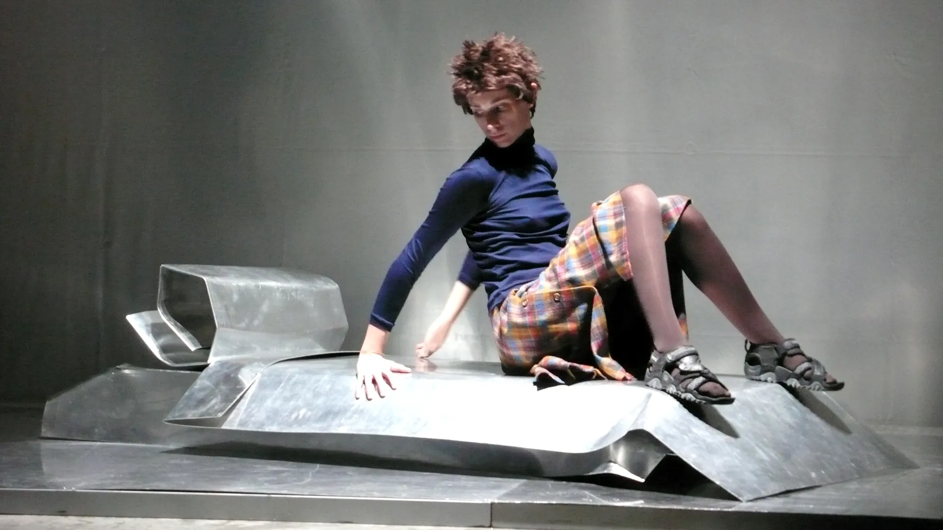 La materia contorta e piegata, il design del pensiero si dispone in uno spaccato, come un rilievo, cinemascope del presente esiliato. Gli oggetti, freddi e lucenti, arredano il pavimento base d’acciaio, dentro i confini del Paese di Exilium. Appena fuori, in terra già straniera, agiscono i corpi che, esponendosi nella più intima occupazione, ri-formano epifanie e parentesi di memoria vitale, umana, sociale. Ma è finzione, reale è solo l’abitare – room dello show – del ricordo, del rimando, del gesto d’addio, e poi del ritorno.
