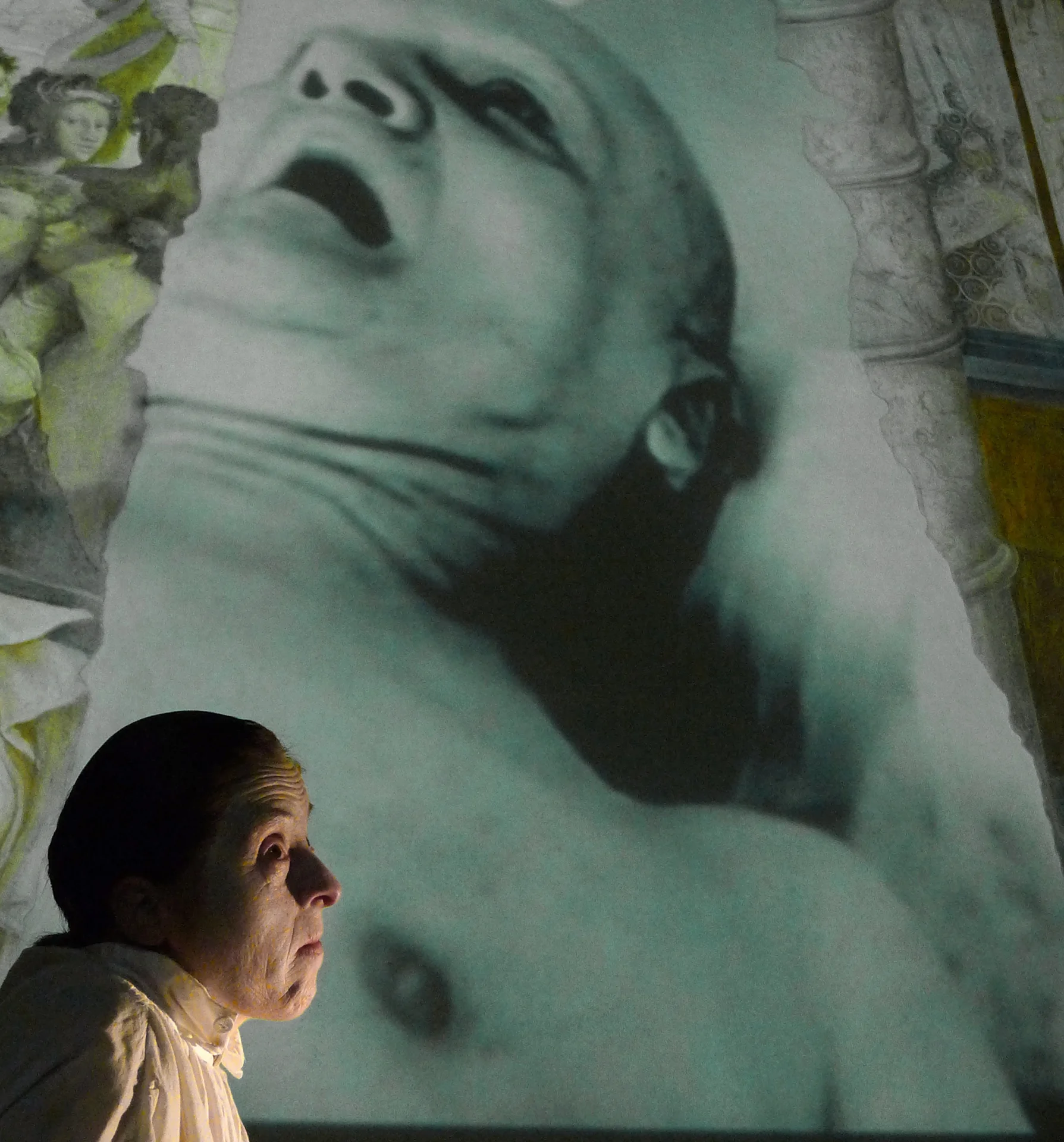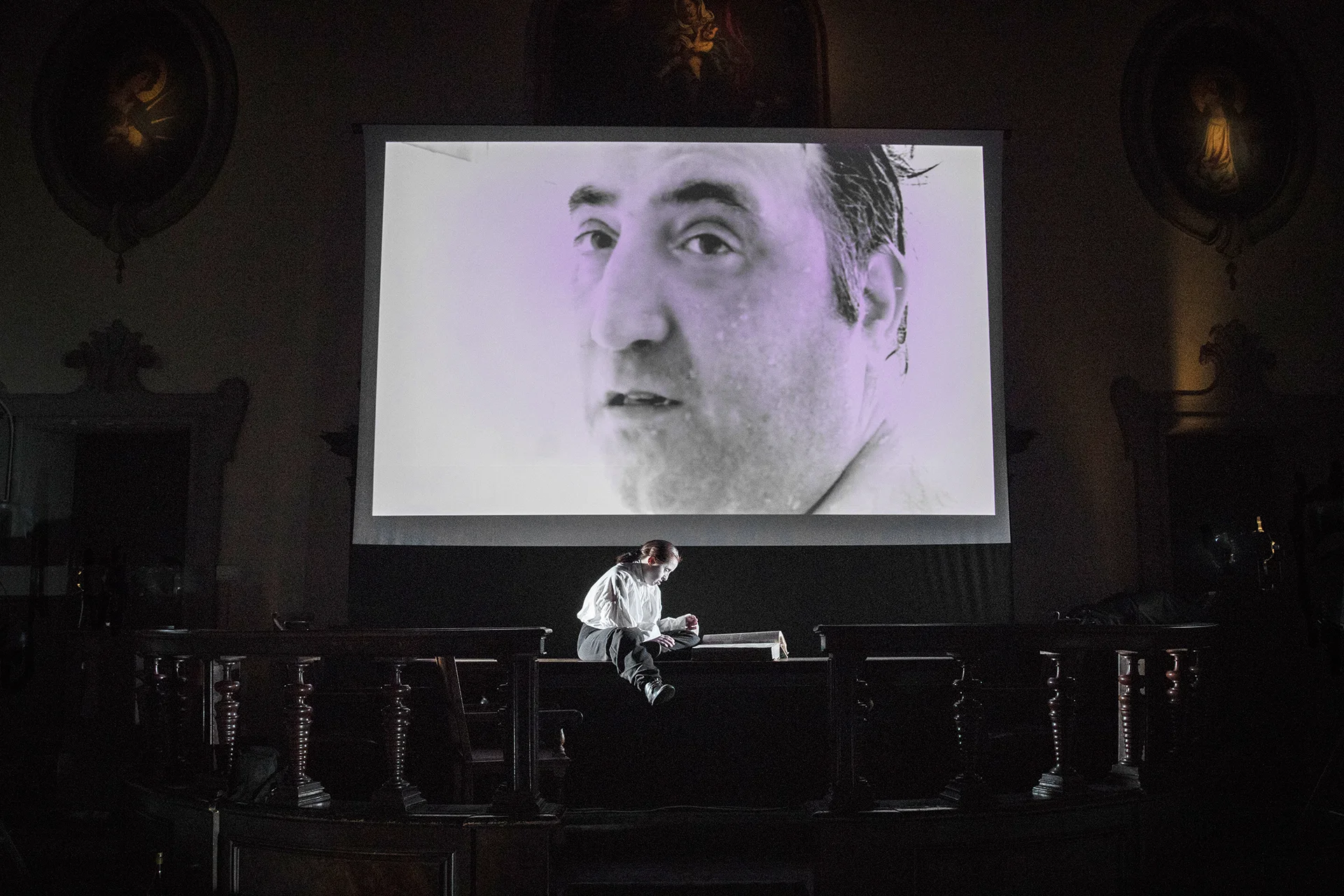 I dialoghi con Orazio, la Regina, il Fantasma del Padre, Guild and Rose, gli Attori, I Becchini, Re Claudio vengono inflessi nell’unico duello eroico possibile, quello dell’attore con se stesso.