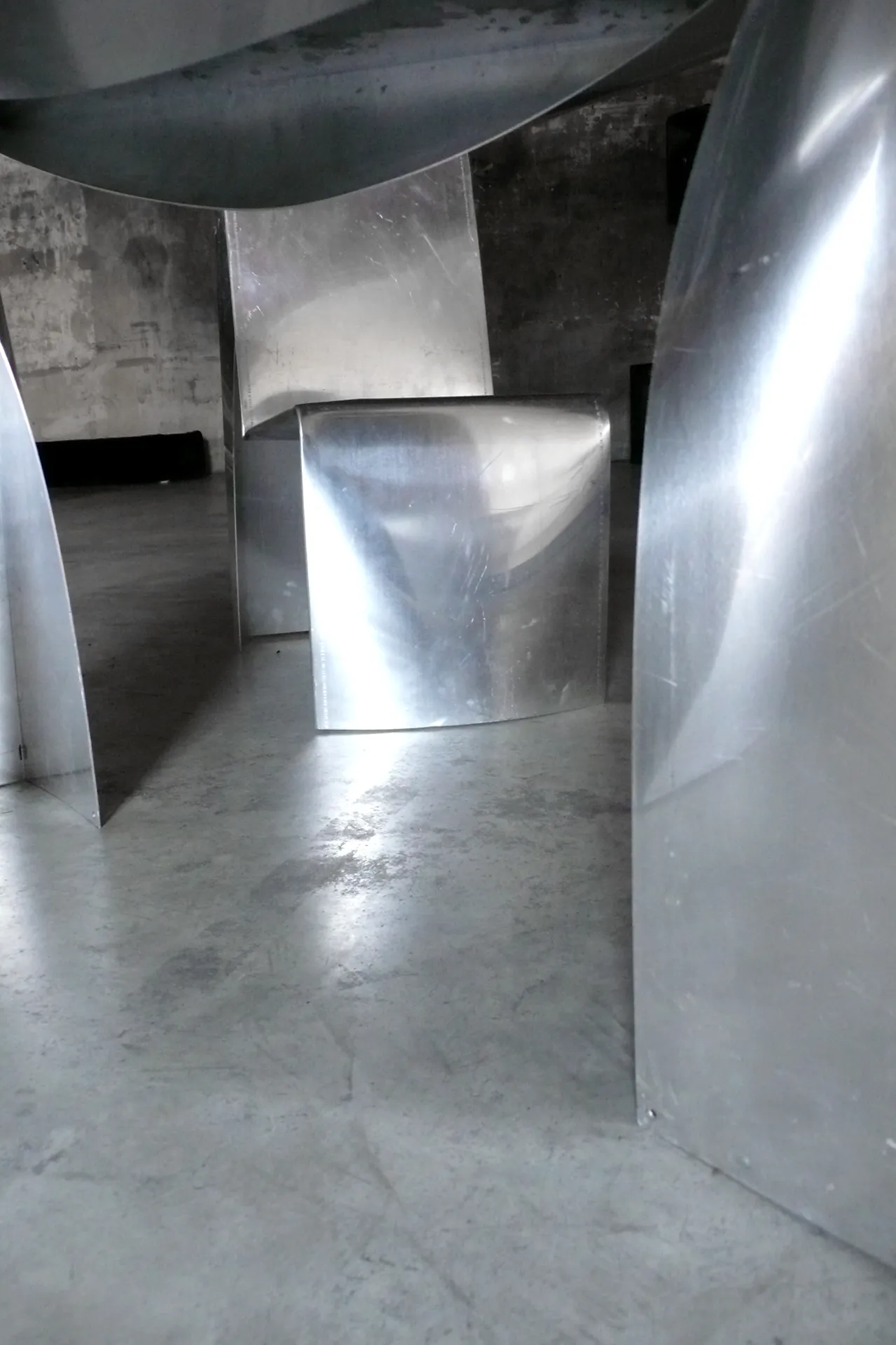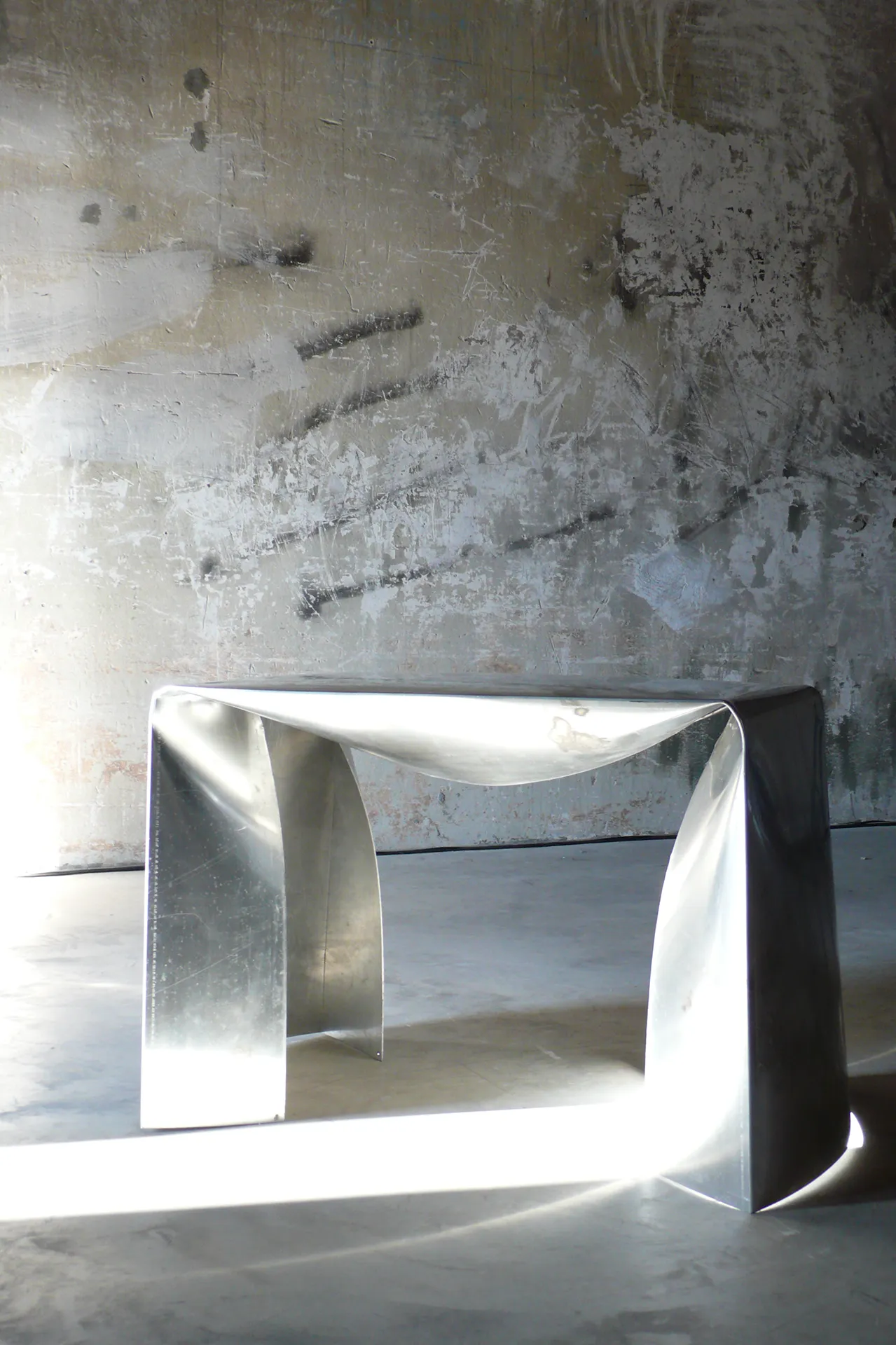 Sale amaro, alumen, alum, un tempo più prezioso dell’oro, cavato da bauxite e piegato dall’artista in ondine concettuali. Pieghe barocche, con material di fine ottocento, chimica e industria e progetto futuro.