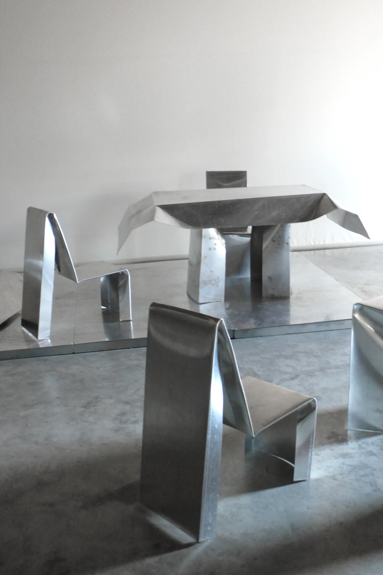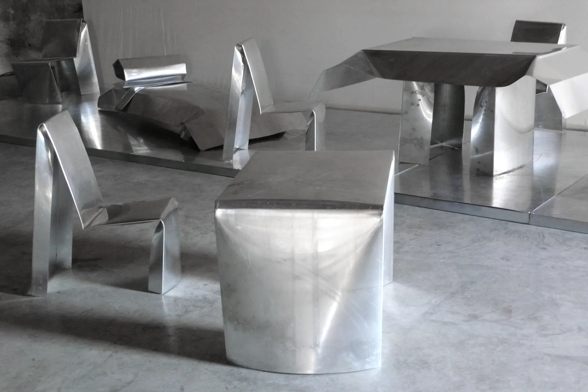 Room dello show, splendente e materico, antico e moderno, piega e material e pulsione. Design ondivago per l’abitare corpo e pensiero, freddo e rilucente come se l’idea pesasse davvero.