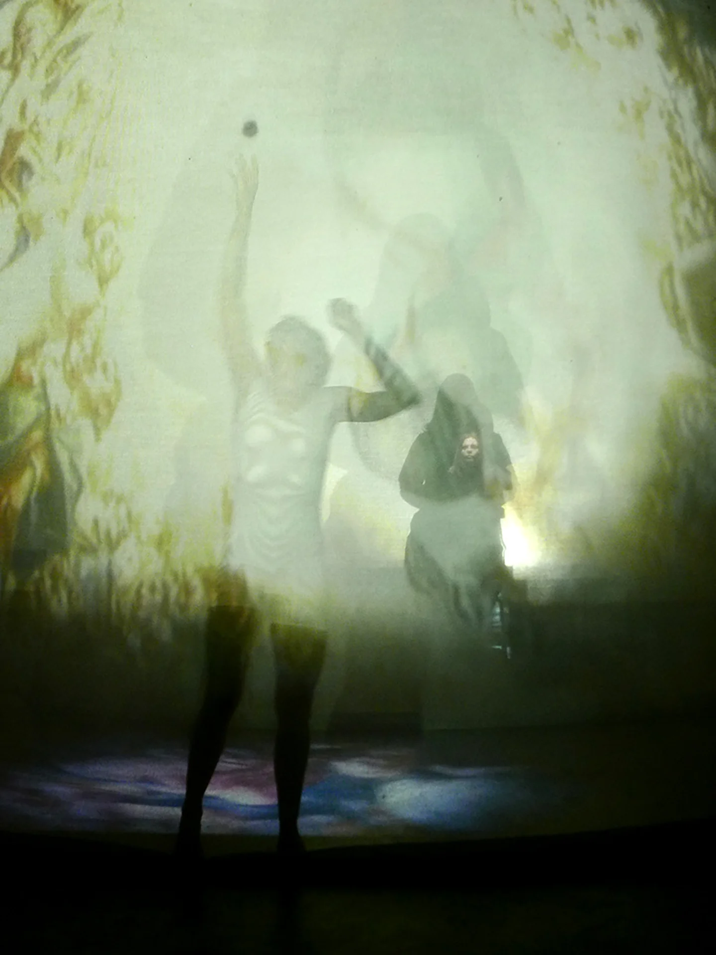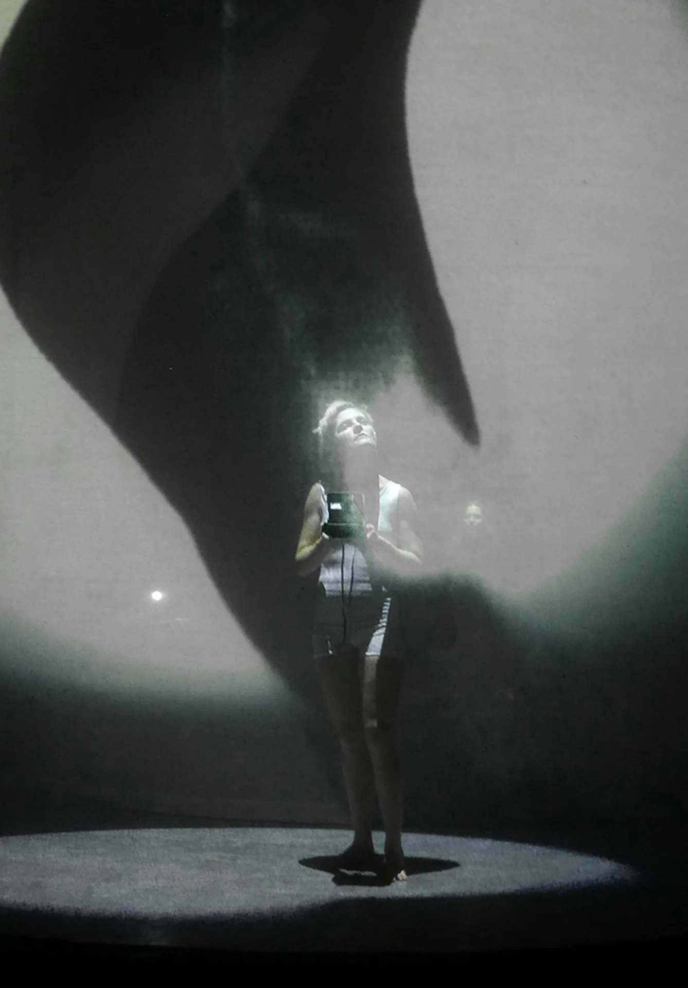 Il doppio velo trasparente e semicircolare della scena ospita l’immagine, la contiene e la curva come lo spaziotempo si piega alla massa dei corpi, nella scena quadridimensionale dove il tempo fluttua tra un prima e un dopo, e insieme materia e immagine fluttuano tra passato e presente.