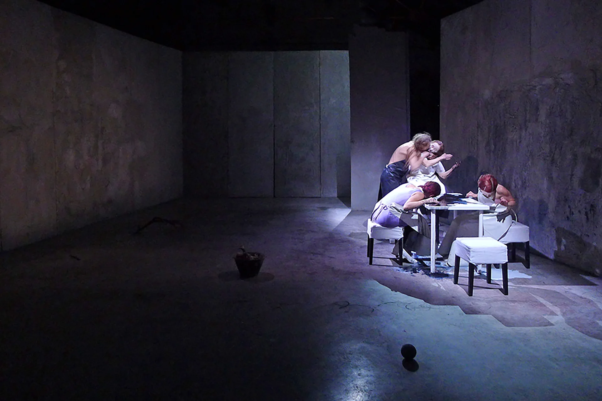 In Latte, il secondo episodio tratto da Le Coefore, l’installazione scenica predispone – simmetricamente al nido/letto abitato dalla madre Clitennestra – alcuni elementi ordinari e attivi della fisica domestica: una tavola artificialmente nutritiva – inondata dal latte nero dell’odio ispirato alla Todesfuge di Paul Celan e ai vortici liquidi di Anish Kapoor – e la tana/culla in cui Oreste si nasconderà per sfuggire alla furia delle Erinni.