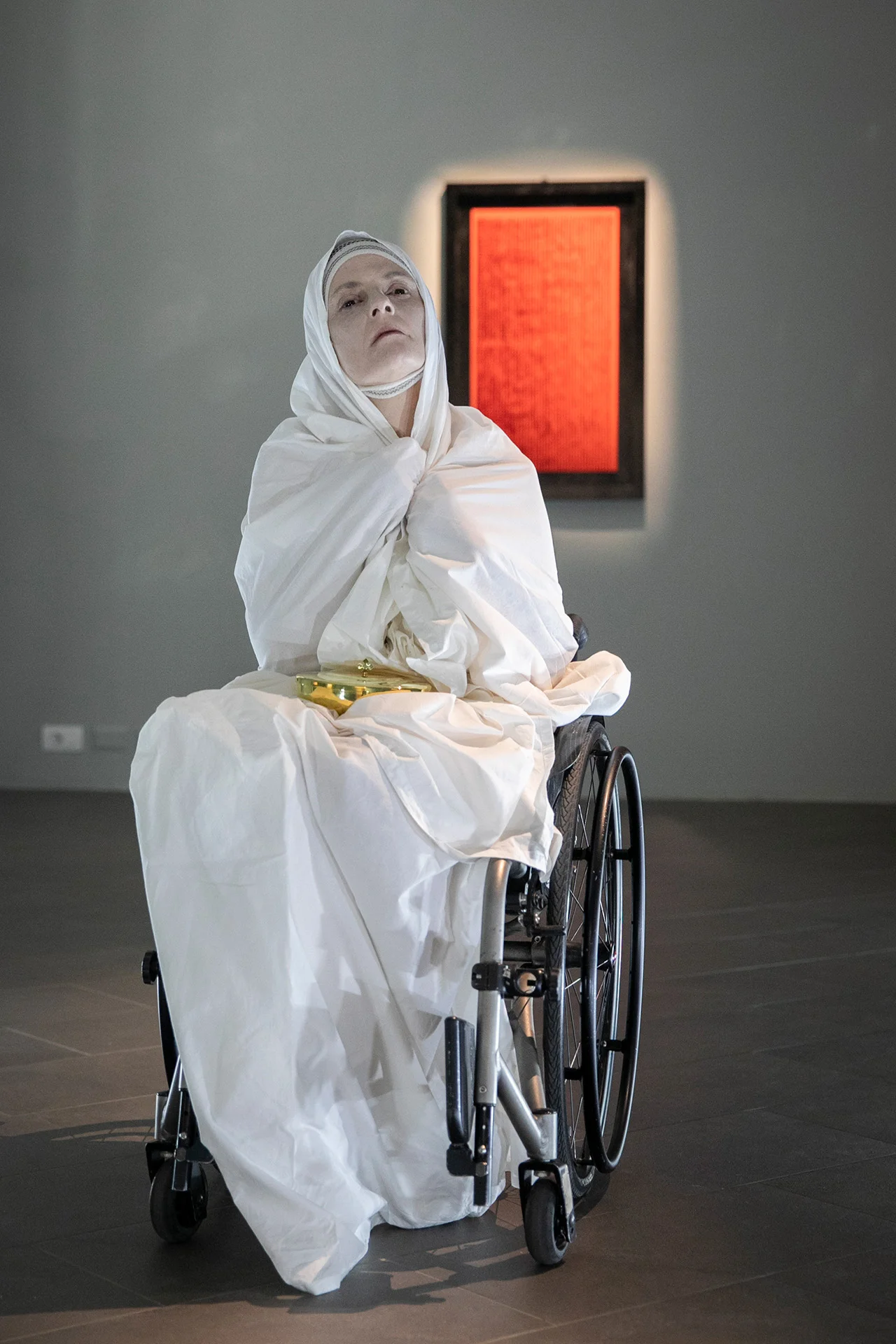 Penso alla convergenza tra le fessurazioni cutanee di Gina Pane e i tagli delle tele di Lucio Fontana. In queste 4 Azioni Sentimentali il sangue assume la dimensione sospesa dell’attesa (‘Attesa, Concetto Spaziale Rosso’, Lucio Fontana 1965) e del ricordo, l’esito della ferita si trasforma in concetto spaziale, in architettura emotiva percepita nel presente, nella perduranza dell’atto performativo. In questa nostra iconostasi non usiamo violenza ai corpi, così già tremendamente violati e addolorati, non inneggiamo al martirio immolatorio, non abbiamo peccati da espiare, non vogliamo essere ‘Criste’. Rifiutiamo la funzione salvatrice della croce, al contrario intendiamo l’atto artistico come un atto di ribellione alla sofferenza, sia nella sua ineluttabilità individuale – derivata dalle patologie fisiche e psichiche – sia nella sua dimensione collettiva – causata dalle violenze che subiscono le vittime delle guerre, delle persecuzioni razziali, sociali o religiose.