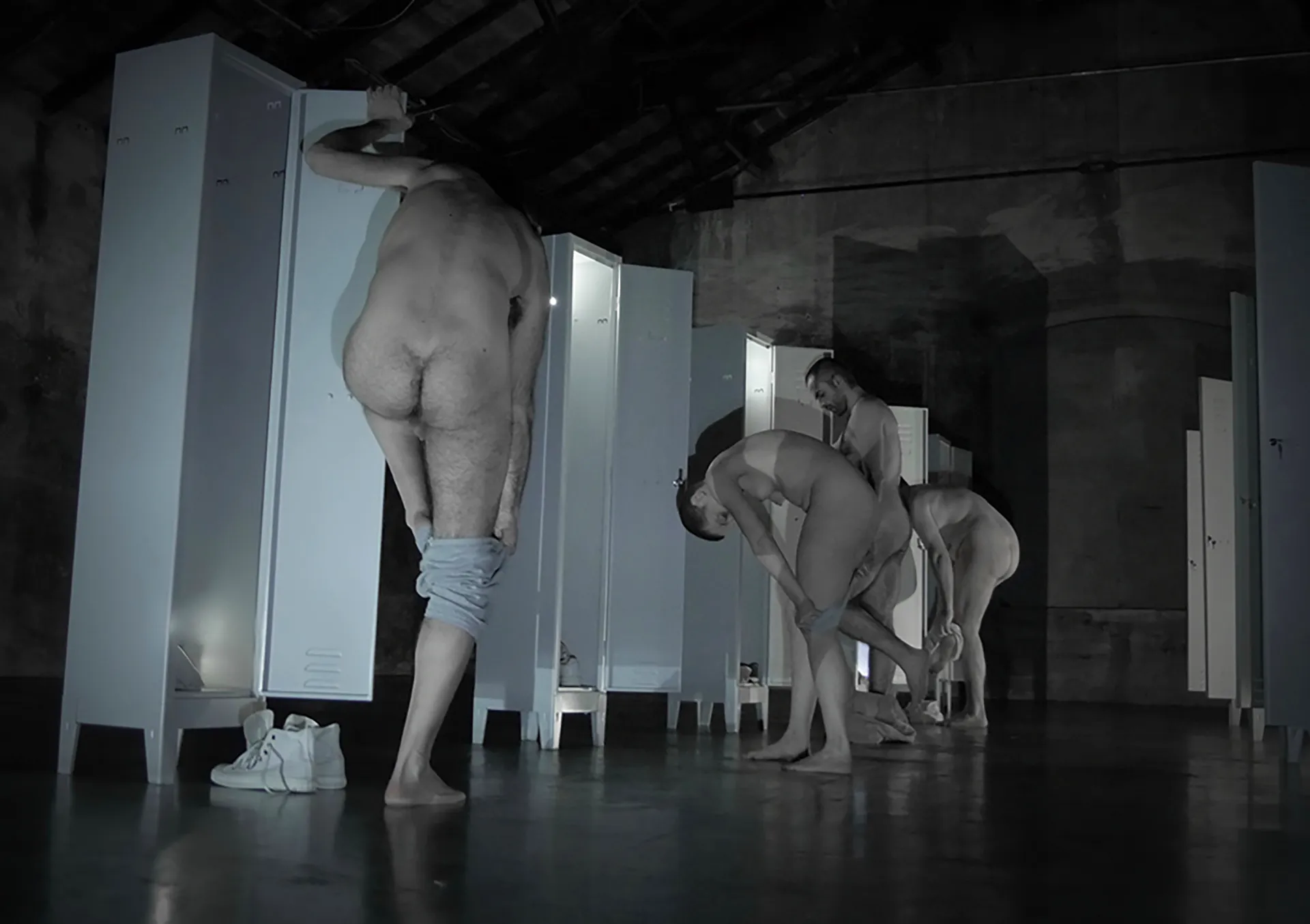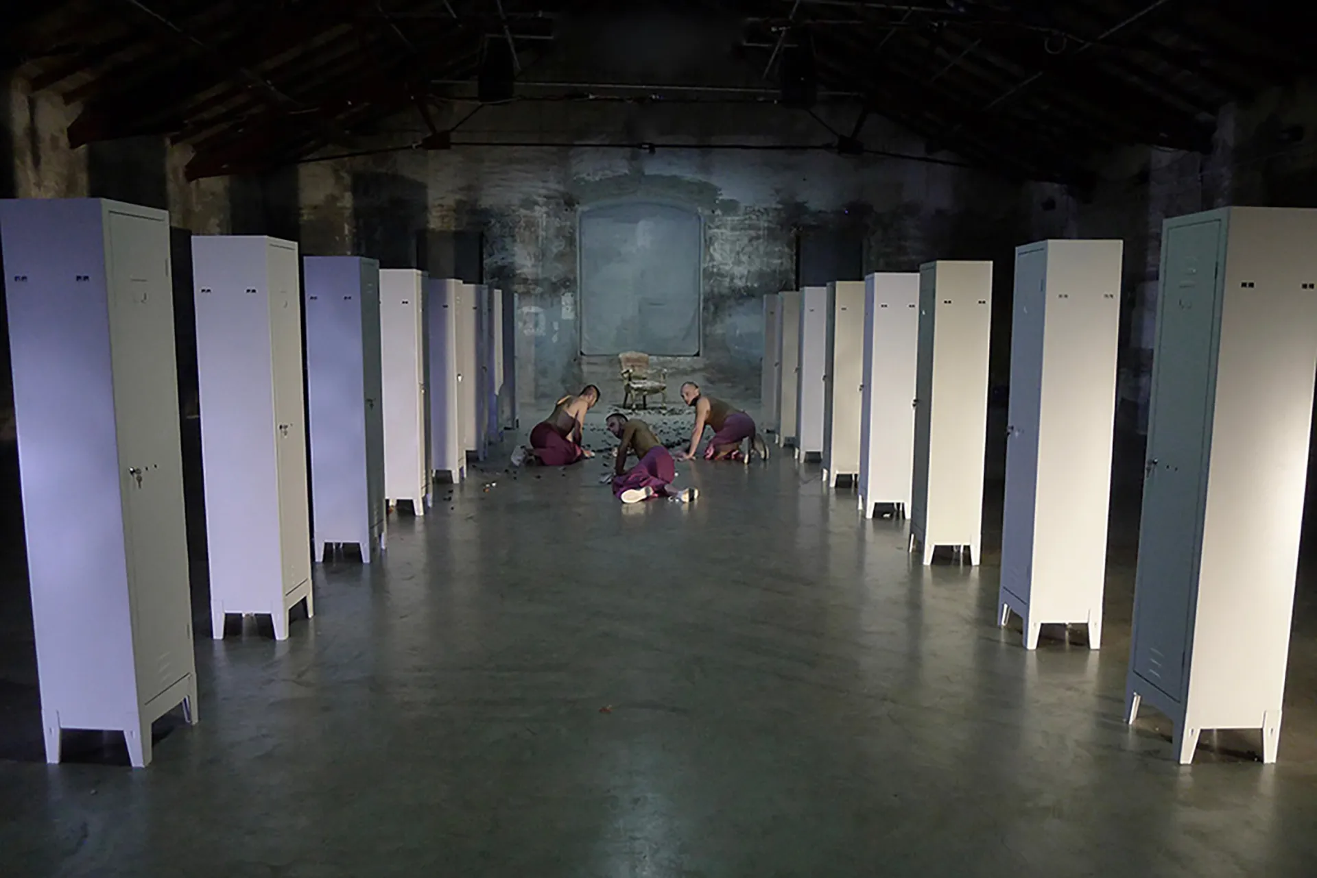 La moltiplicazione degli scomparti installati nello spazio scenico determina l’oscillazione tra l’uno e l’altro aspetto, permettendo di ‘figurare’ la doppia dinamica su cui si muove la drammaturgia: la pienezza corporea della identità omosessuale dell’atleta e la secchezza identitaria del corpo dell’internato, privata di ogni segno sessuale, la sua negazione assoluta nel campo di sterminio. Solo una fuga, una corsa senza fine, a sostituirne la forma affettiva e corporea.
