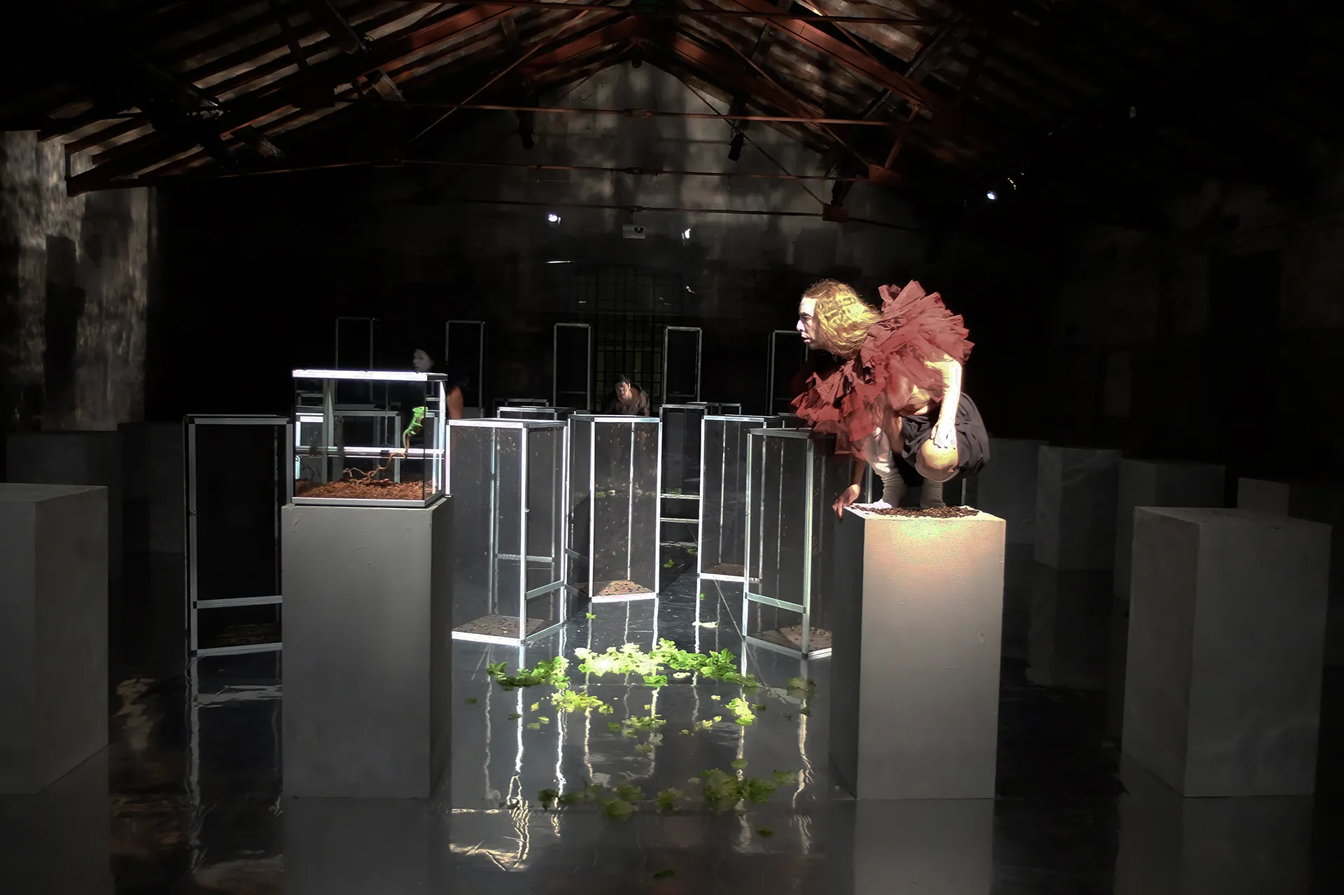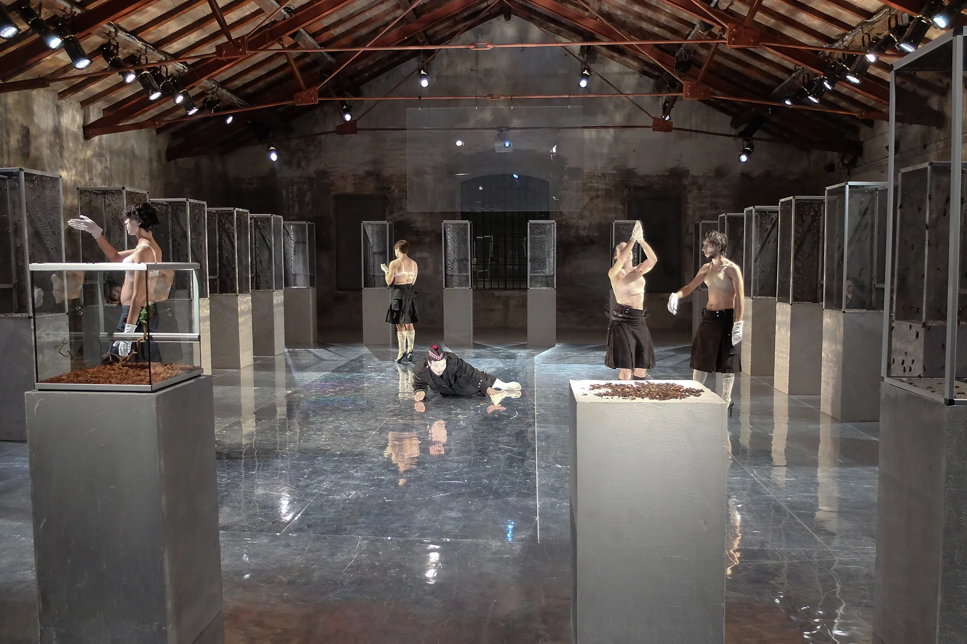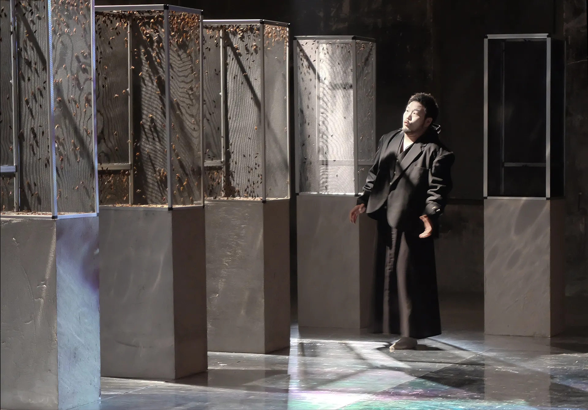 L’installazione del Verdi Macbeth è composta da ventiquattro terrari abitati da migliaia di grilli e insetti vivi il cui frinire costituisce, insieme alle voci verdiane, il materiale sonoro dell’opera. Lo spazio scenico riproduce la struttura architettonica dell’antico santuario dedicato al culto di Hecate – divinità che regna sui demoni e sui morti – funzione drammatica fondamentale dell’opera shakespeariana. Nell’area sacra il continuum ossessivo del canto dei grilli si impossessa progressivamente dell’intero spazio sonoro, in un crescendo simmetrico alle ossessioni di Macbeth e Lady Macbeth. La natura entra nel disegno installativo dell’opera come un principio orrorifico fantastico e reale insieme. Il paesaggio interiore di tormenti, ossessioni e paure si fa prova, estensione sensibile del soggetto. L’ineluttabilità del ciclo morte-vita nella Phisis – principio e causa di tutte le cose – non attenua, non elude la responsabilità della colpa, ma ne dissolve la retorica eroica.